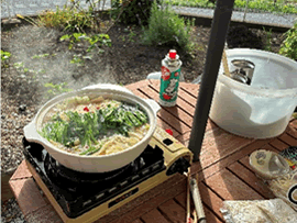 写真は、タケヒコオーナーのコンビニ・トレンドⅡから、クマ出没情報でキャンプに行けないため、炎天下の庭でもつ鍋大会。おい、アタマ大丈夫か!?(笑) コンビニ・トレンドⅡ「キャンプに行けないからって」