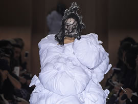 写真は、ファッションの達人140「メメント・モリ 死を描いたファッションショー」で紹介しているコムデギャルソンの新作ファッション。まるで死装束のようです。