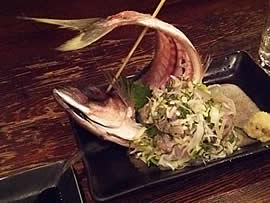 写真は、粟ちゃんの愛のはしご酒#018「出張自主練」から久兵衛のアジ刺し。刺身を食べ終えると、ガラをから揚げにしてくれるそうです。 (※このコンテンツは公開終了しました。)