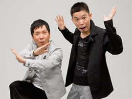 写真は、アンブレラあつしの風に吹かれて39「爆笑難題」の背景画像である爆笑問題。爆笑は難しいから、せめて失笑・苦笑にしてくれとのことで(笑) 風に吹かれて「爆笑難題」