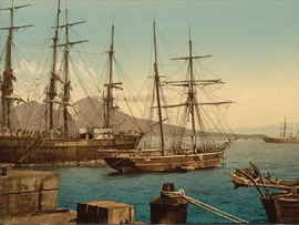 写真は、葉羽のコーヒーブレイクその96「ナポリ今昔」からの100年前のナポリ港の帆船。これ…絵じゃありません。