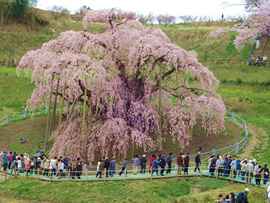 写真は、アンブレラあつしの風に吹かれて65「何事もクサラず待てばサクラ咲く。」から三春町の滝桜。こんな風に咲いてくれれば…(笑)
