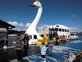 写真は、Storyスナップ30-2「猪苗代湖遊覧船の巻」からの一枚。ところが乗り込むのはこの船じゃなくて…。