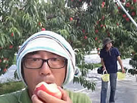 写真は、アッキーと仲間たち/僕たちの旅#036「桃狩り体験」からの一枚。福島市飯坂町にて。後ろの美形は奥様です! 僕たちの旅「桃狩り体験」