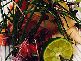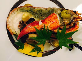 写真は、fumieの南風亭有情#97「オマールエビの岩塩焼き」。秋の特選メニュー”月夜の案山子コース”からの一品。