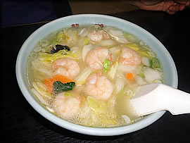 写真は、再編集の新・僕達のラーメン道76「極旨もやしラーメン/龍園」からエビそば。このプリップリのエビを見よ!