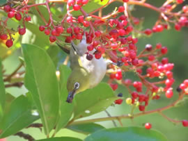 写真は、T.sakumaの野鳥ギャラリー第14集「9月の鳥さんたち」からメジロ。赤い実とのコントラストが美しい写真。 野鳥ギャラリー「9月の鳥さんたち」