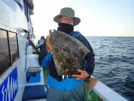 写真は、太公望フジにゃんの一竿風月その46「ヒラメ釣りの巻」からの一枚。マスクの下はきっとドヤ顔?