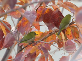 写真は、T.sakumaの野鳥ギャラリー第16集「秋の訪れ」からメジロ。背景の紅葉とマッチしてとても美しい…。