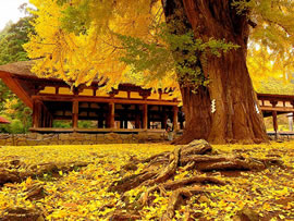 写真は、アンブレラあつしの風に吹かれて104「芸術の飽き」より喜多方市熊野神社の長床。修験者の修行場だったものですが、この大銀杏が有名。