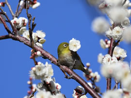 写真は、T.sakumaの野鳥ギャラリー第22集「春の足音」からの一枚。真っ青な空に白梅とメジロが映えます。 野鳥ギャラリー「春の足音」