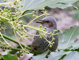 写真は、T.sakumaの野鳥ギャラリーvol.24「春の野花と野鳥」からの一枚。ヤツデの実をついばんでいるところ。