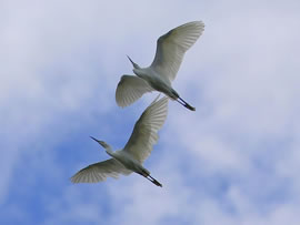 写真は、瞬間の魔術師T.sakumaの野鳥ギャラリー第43集「天高く」からの一枚。透き通った秋空にコサギのツガイが悠々と飛翔しています。シャッター・チャ~スを逃しません。 野鳥ギャラリー「天高く」