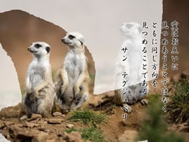 写真は、絵島太夫の書の心捕逸の8「共の心」からの一枚。”共に”がテーマなんですが、ミーアキャットって必ず同じ方向を向くんですよね。何でかな?