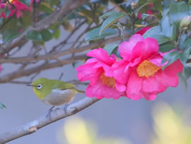 写真は、瞬間の魔術師T.sakumaの野鳥ギャラリー第51集「山茶花とメジロ」より。年中見かけるメジロですが、山茶花の花が一番似合うということで。 野鳥ギャラリー「山茶花とメジロ」