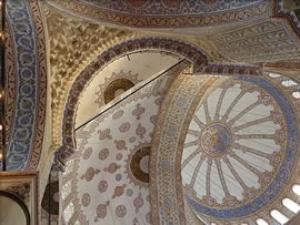 写真は、まめしばトルコ紀行第11集「ブルーモスク編」からの一枚。ブルーモスクの礼拝堂の天蓋には、美しいブルータイルが張り巡らされていました。