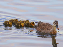 写真は、瞬間の魔術師T.sakumaの野鳥ギャラリーVOL.68「カルガモ親子」より。この雛たち、つい、お風呂に浮かべてみたいと思っちゃいませんか?(良い子はマネしちゃだめだぞ:笑) 野鳥ギャラリー「カルガモ親子」