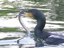 写真は、瞬間の魔術師T.sakumaの野鳥ギャラリーVOL.69「鵜とウナギの格闘」より。食べようとする鵜、そうはさせじとウナギ・・まるでゴジラ対キングギドラ?(笑)