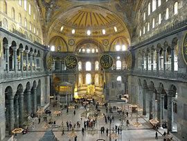 写真は、まめしばのトルコ紀行第13集「アヤソフィア編」よりアヤソフィア大聖堂の二階回廊からの景色。正面の聖地メッカの方向を向いて礼拝します。