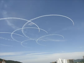 写真は、Storyスナップ「感動!東北六魂祭」よりシンボルの六輪の和。福島市の真上に巨大な輪を描いたのはブルーインパルスの見事な飛行技術! Storyスナップ「真上の怪人編」