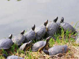 写真は、瞬間の魔術師T.sakumaの野鳥ギャラリーからの一枚。暖かな春の陽射しに誘われて、たくさんのカメが日向ぼっこに現れました。 野鳥ギャラリー「春の陽射し」