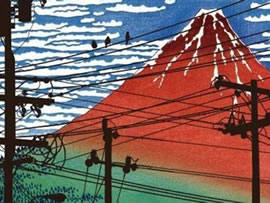 写真は、謎のおじさんアンブレラあつしの風に吹かれての背景画像「電線がある赤富士」。時代劇に時たま映り込むことがありますよね。