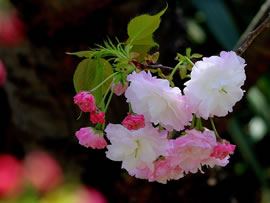 写真は、野鳥ギャラリー「春の花々」からの一枚で「松月桜」。江戸時代以前からある栽培品種。蕾時点の色濃い紅色が白い花になっていくのが不思議です。 野鳥ギャラリー「春の花々」