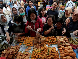 写真は、JUNの海外駐在員便りから断食月のインドネシアの市場。日没後から夜明け前までははドカ喰いするので、ラマダンが終わるとかえって太ってしまうとも(笑) 海外駐在員便り「インドネシアのラマダン事情」