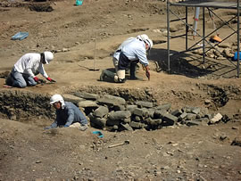 写真は、Storyスナップ「ヨッシーと葉羽の京都発掘旅行」から京都鴨沂高校の発掘現場。宝永の大火の残骸をそのまま埋めたため、古い墓石や石塔の破片がぎっしりと。 Storyスナップ「発掘現場編」