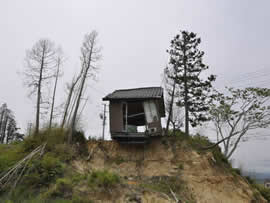 写真は、金澤文利特別寄稿「闇の中の黒い馬」からの一枚。大震災で丘の上に取り残された家が崩れもせずに宙ぶらりんで。そりゃあ二度見しちゃいますよね? 闇の中の黒い馬「伝えたいこと」