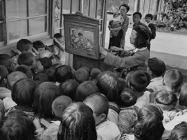 写真は、謎のおじさんアンブレラあつしの「風に吹かれて」から、昭和の紙芝居の様子。駄菓子を買って、それをしゃぶりながら見てたっけなぁ・・子供の頃。