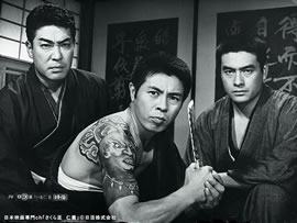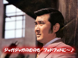 写真は、謎のおじさんアンブレラあつしの「風に吹かれて」より。演歌歌手であり任侠映画スターとしても活躍した村田英雄の出演作「さくら盆 仁義」の一場面。