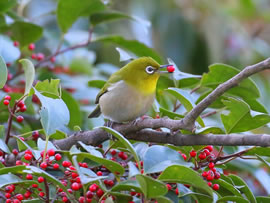 写真は、瞬間の魔術師T.Sakumaの野鳥ギャラリーより実をついばむメジロ。写真がこの公園の管理者の目に留まり、新しいパンフレットの表紙に採用されたものです♪