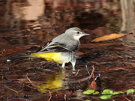 写真は、瞬間の魔術師T.Sakumaの野鳥ギャラリーから"キセキレイ"。今回のテーマは冬鳥たちですが、枯葉の浮かんだ流れの中で虫を探す黄色の下腹が鮮やかです。
