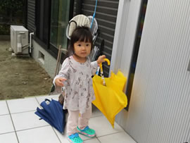 写真は、Storyスナップ「湯の浜オーシャンビューの旅」の完結編より。車を返しに行ったサオリの家で孫娘オリカちゃんが傘を持ってお出迎え♪