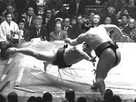 写真は、月曜日の男ツーさんの雑感から1969年春場所の大鵬・戸田戦。物言いの末、左戸田に軍配。大鵬の45連勝がストップ。ところが後日、ビデオで確認すると・・。