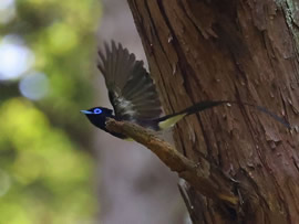 写真は、瞬間の魔術師T.sakumaの野鳥ギャラリーよりサンコウチョウ。長い尾羽のラインが美しく、出会うのはかなりレアな出来事です。 野鳥ギャラリー「長い尾羽に魅せられて」