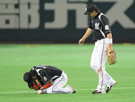 写真は、月曜日の男ツーさんの雑感から史上最大の下克上と呼ばれた2010年クライマックスシリーズで、三位だったロッテが優勝し、西岡が男泣きした場面。