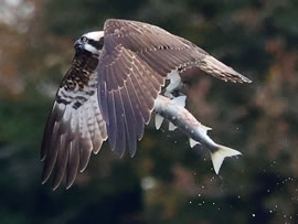 写真は、瞬間の魔術師T.sakumaの野鳥ギャラリーよりミサゴが巨大なボラを捕えて水面から飛び出した場面。この後、このままどこかへ去って行きました。