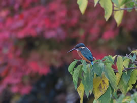 写真は、瞬間の魔術師T.sakumaの野鳥ギャラリーより紅葉を背景にしたカワセミ。野鳥カメラマンたちは、これを”モミカワ”と言うのだそう。 野鳥ギャラリー「紅葉とカワセミ」