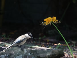 写真は、瞬間の魔術師T.sakumaの野鳥ギャラリーより、2022年ベストショットの一枚。オナガが黄色い曼殊沙華とツーショットで撮れました♪