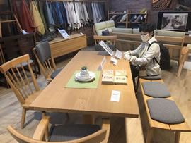 写真は、Storyスナップの新編「仙台・松島迷走の旅」より仙台港の東京インテリアでテーブル・椅子を物色中のケイコ。ウチじゃなくReiちゃんの新築向けですが。