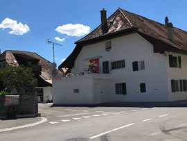 写真は、Reiさんの「思い出に出会う旅」第9集より。レストランを出ると正面の家にも大きなスイス国旗が掲げられて。日本の建国記念日も昔はこうでしたが。 思い出に出会う旅「友人の実家にて」
