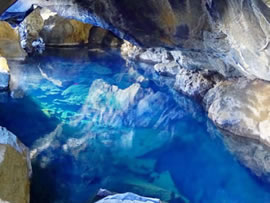 写真は、コバルトブルーの色も鮮やかなアイスランドの地底温泉グリョゥタギャウ。今回は、地底にある美しい湖を特集しました。 コーヒーブレイク「シークレット・レイク」