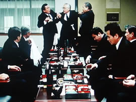 写真は、カリスマ彰版cinemaアラカルトⅡより1989年の東映映画『社葬』のワンシーン。社長の突然の腹上死によって巻き起こる大新聞社の後継者争い。