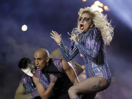 写真は、毒舌亭の常緑音楽館便りより、スーパーボウルのハーフタイムショーで歌唱するレディー・ガガ。曲は米国第二の国歌とも言える「我が祖国」。派手だね~