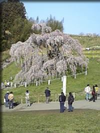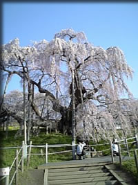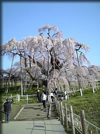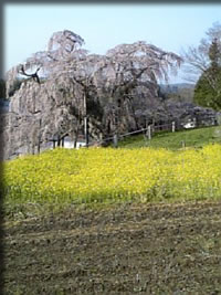 空の青、菜の花の黄色、そして雄大な滝桜。いいでしょ。