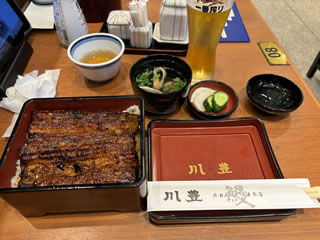 集合場所確認と下見。成田市で老舗だと聞き空港のレストランで「川豊」の鰻重と一番搾りをいただきました。