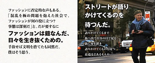 オフィシャル・サイトにあった『ビル・カニンガム語録』がとても素晴しい内容なので、併せて以下にご紹介いたしましょう。