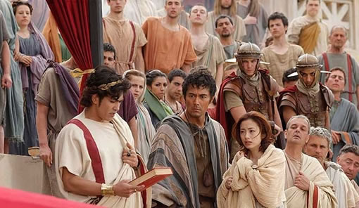 皇帝ハドリアヌス(市村正親)は、争っていた国々に一部領土を割譲するなど融和政策を進めていたのですが、あくまでも武力による世界征服をあきらめない元老院と対立。